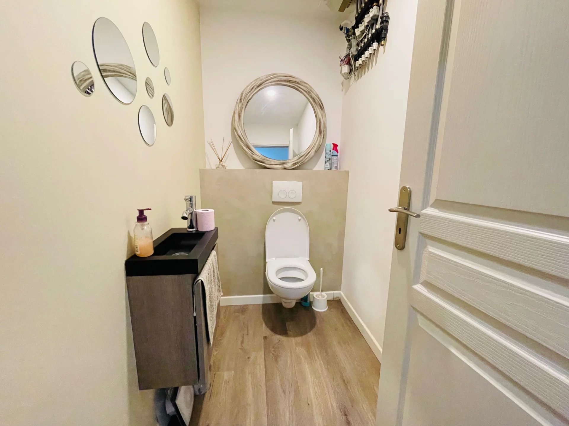Au niveau inférieur, et en rez de jardin, une seconde entrée indépendante, un grand garage double de 54 m², 123.50 m² de pièce de stockage et un appartement indépendant composé d'une cuisine, de wc, et de deux pièces de respectivement 21.45 m² et 17.96 m², idéales pour une activité indépendante ou un regroupement familial.